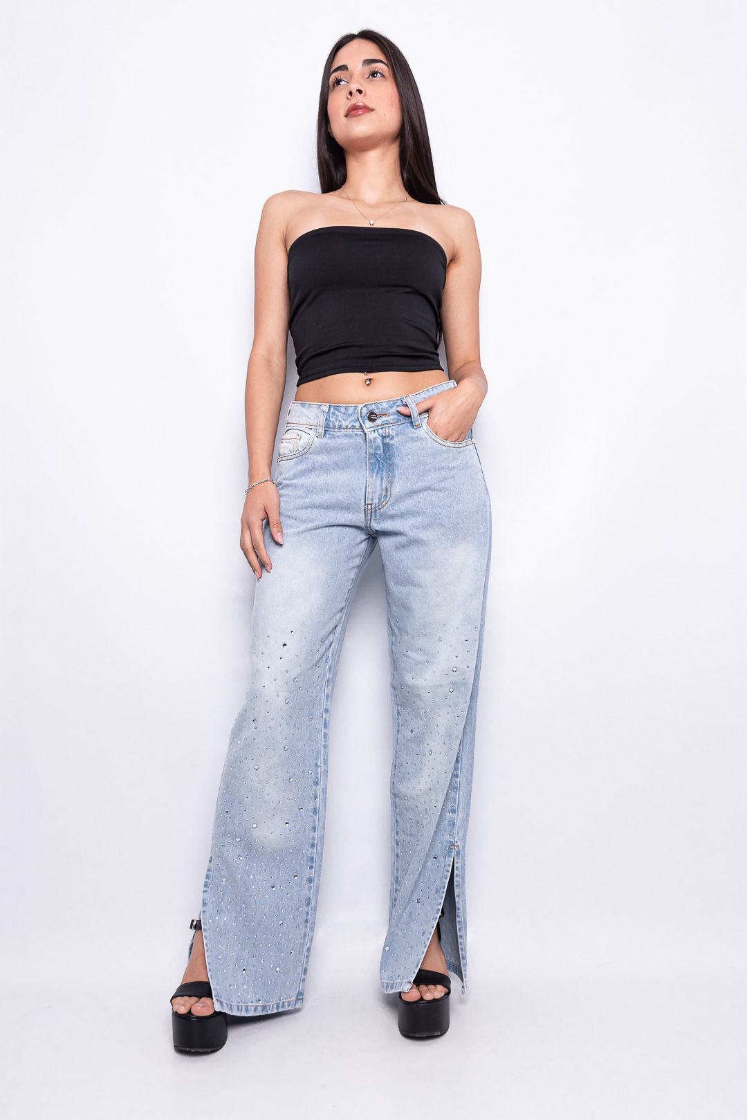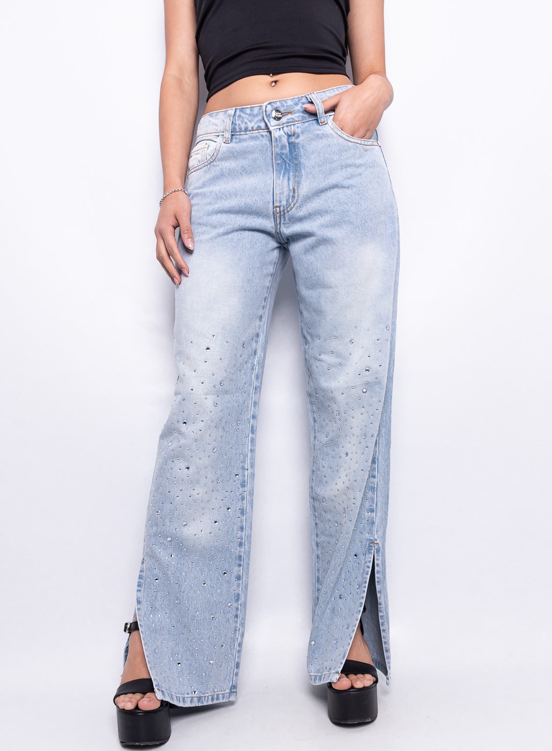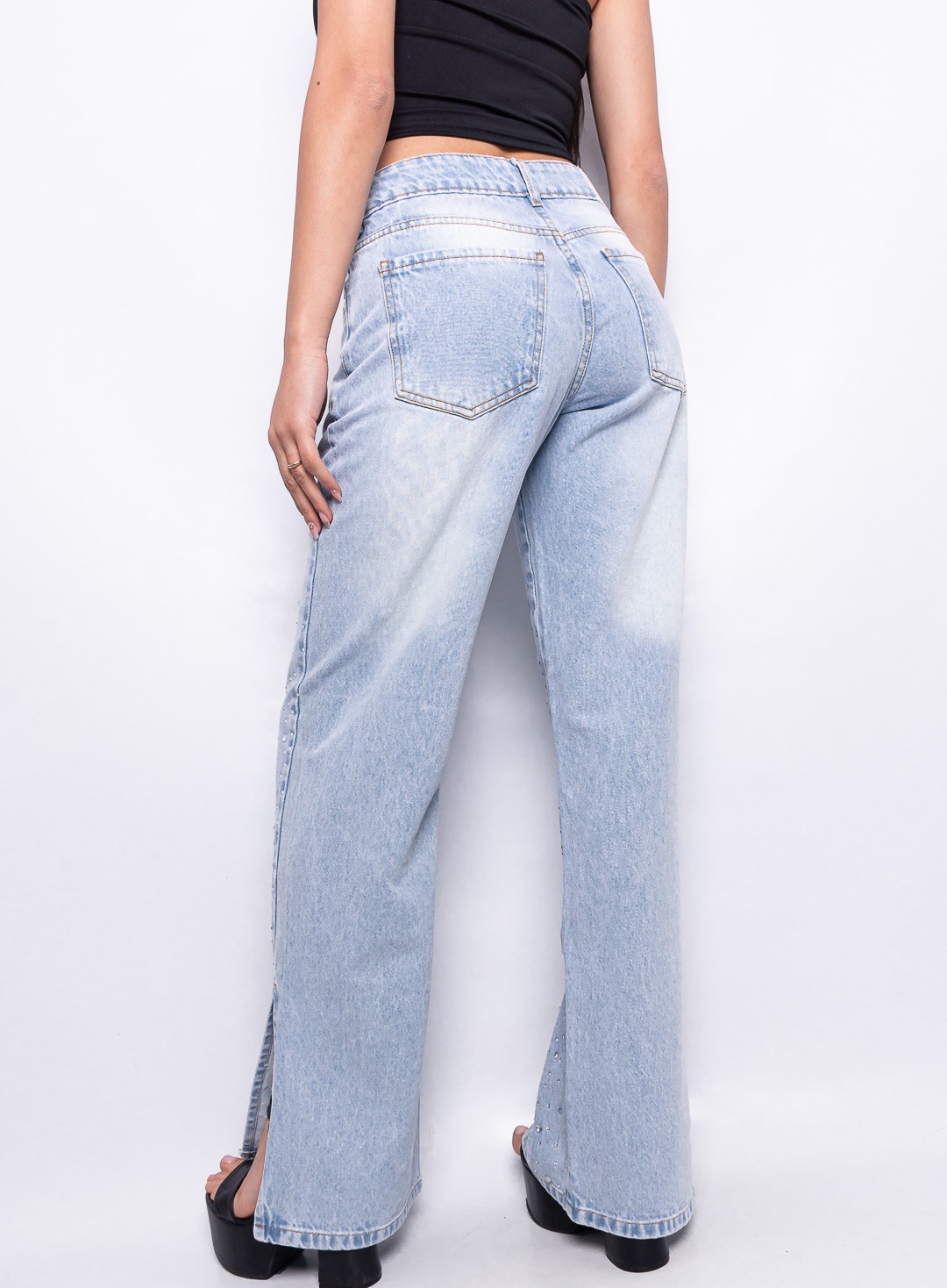 Jean recto CELESTE nevado HOT FIX lateral con tajo ruedo normal