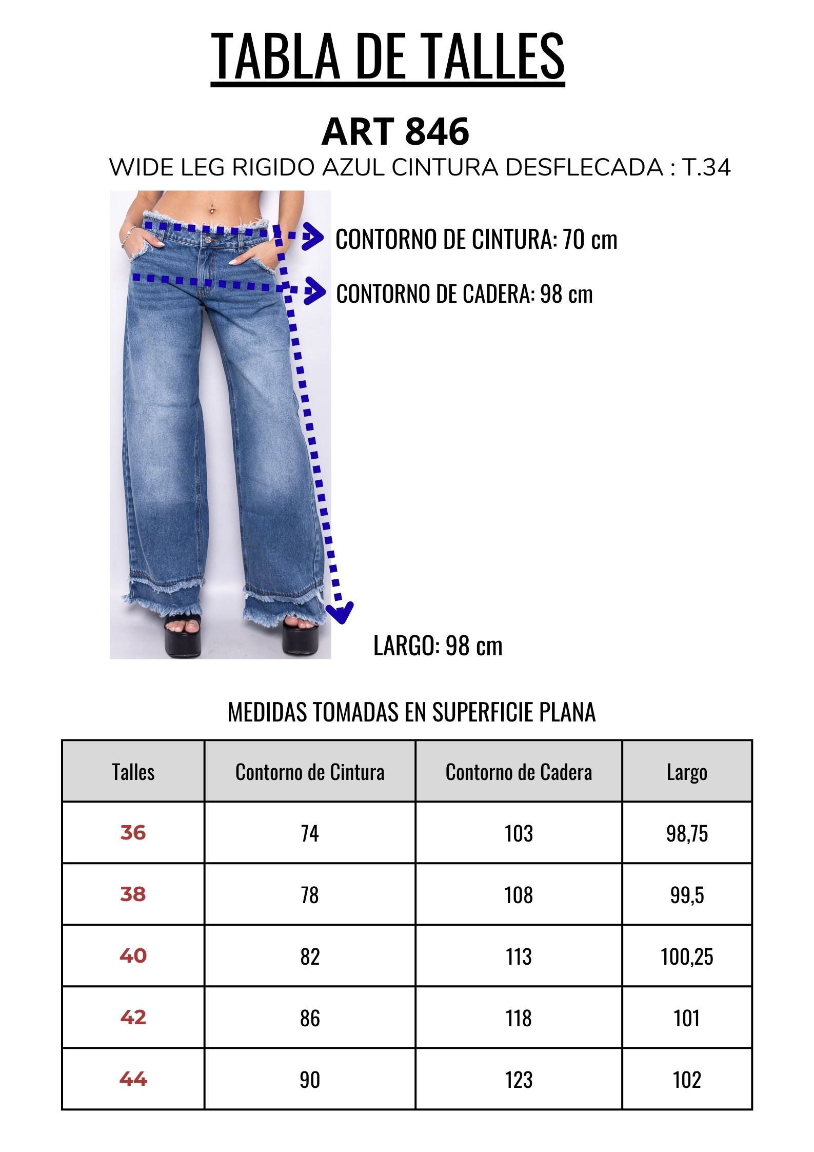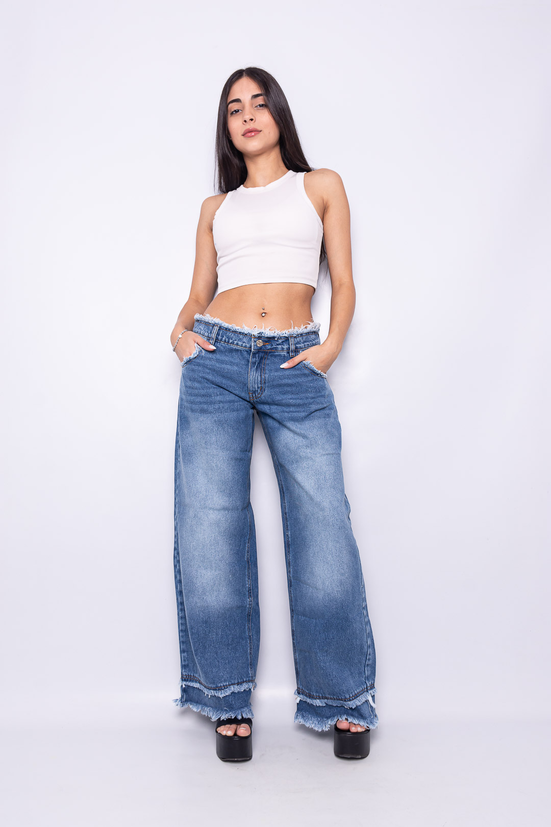 Wide leg rígido azul localizado tiro bajo con cintura y ruedo desflecado
