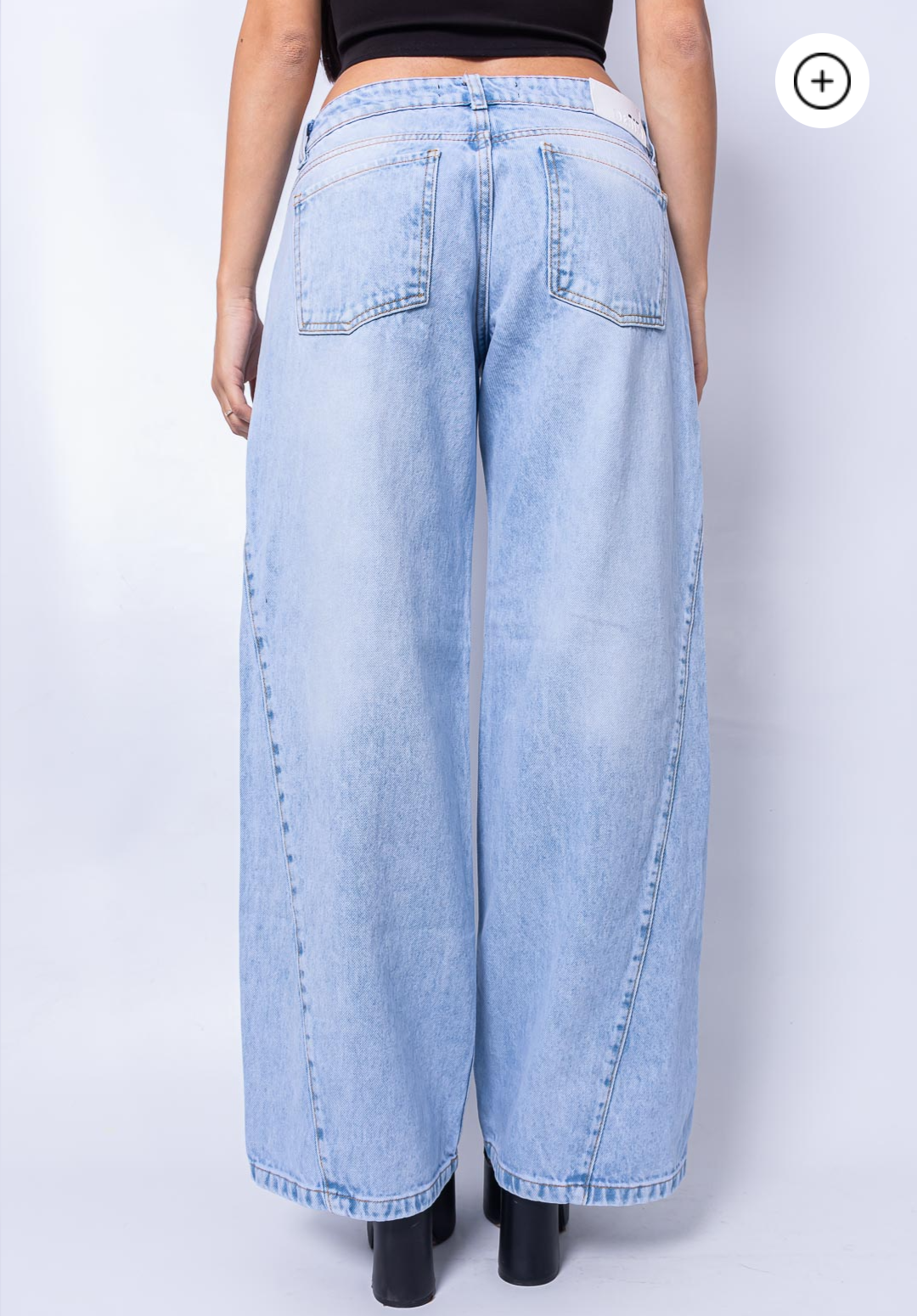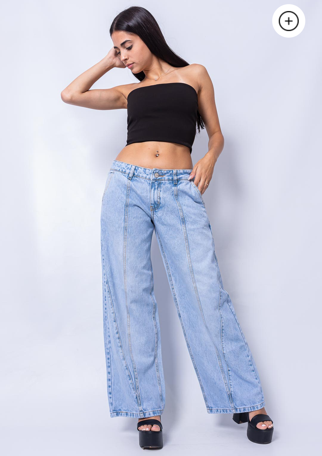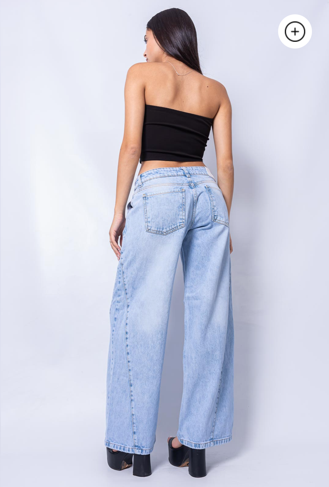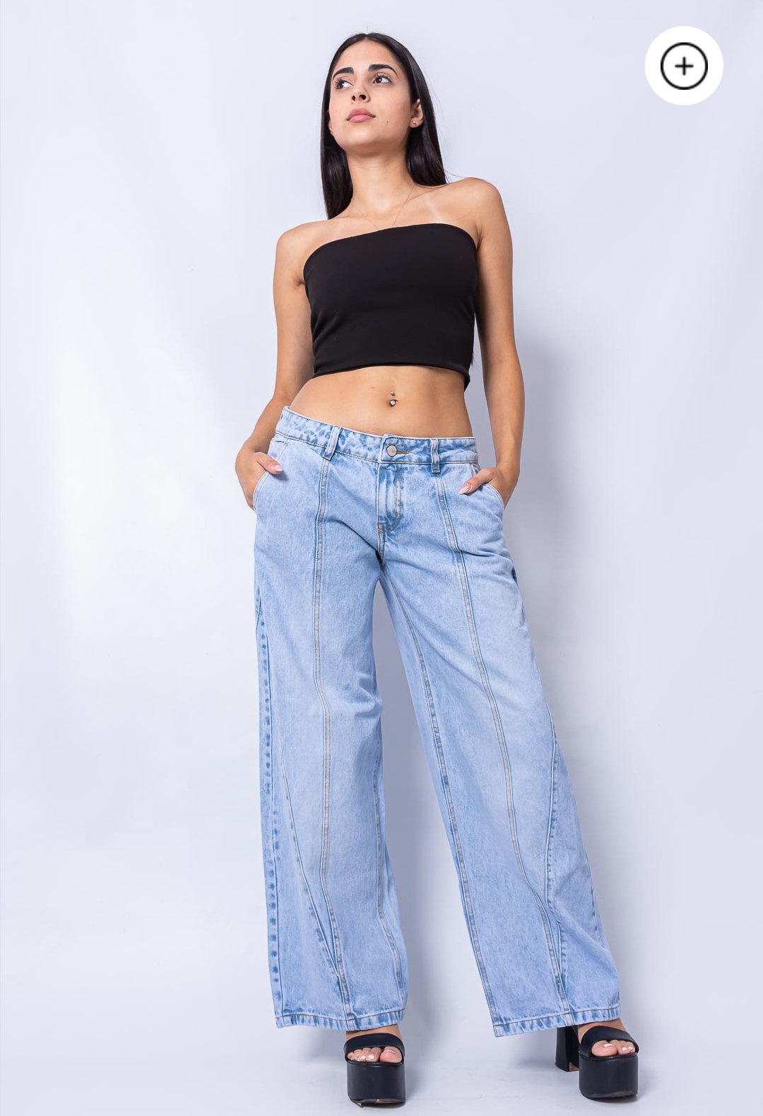 Wide leg rígido tiro bajo celeste nevado con recorte triangular ruedo normal